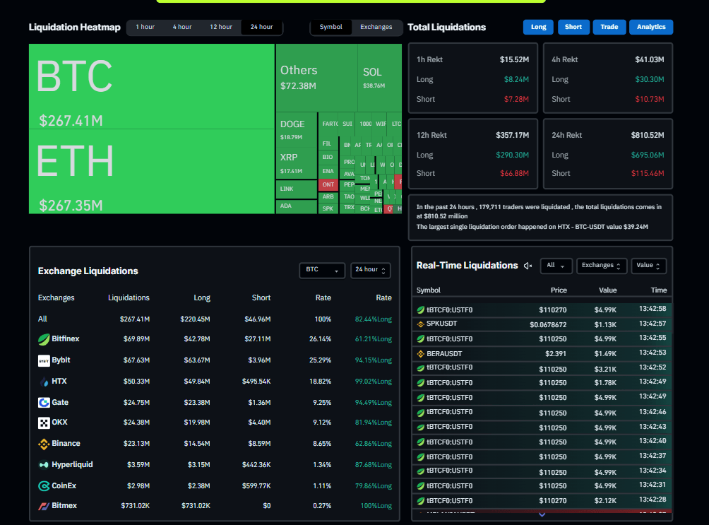 Esta corrección de precios en la criptomoneda más grande por capitalización de mercado había desencadenado una ola de liquidaciones en todo el mercado cripto. El mapa de liquidaciones de CoinGlass a continuación muestra que 179.722 traders fueron liquidadas en las últimas 24 horas, con liquidaciones totales que superan los 800 millones de dólares. Más de 267 millones de dólares provienen solo de BTC, con más del 82.44% de las posiciones siendo largas, lo que indica un posicionamiento excesivamente alcista. Aparte de liquidar posiciones largas sobreapalancadas, la mayor liquidación única ocurrió en el intercambio Huobi (HTX), donde se liquidó una posición BTC/USDT por valor de 39.24 millones de dólares.