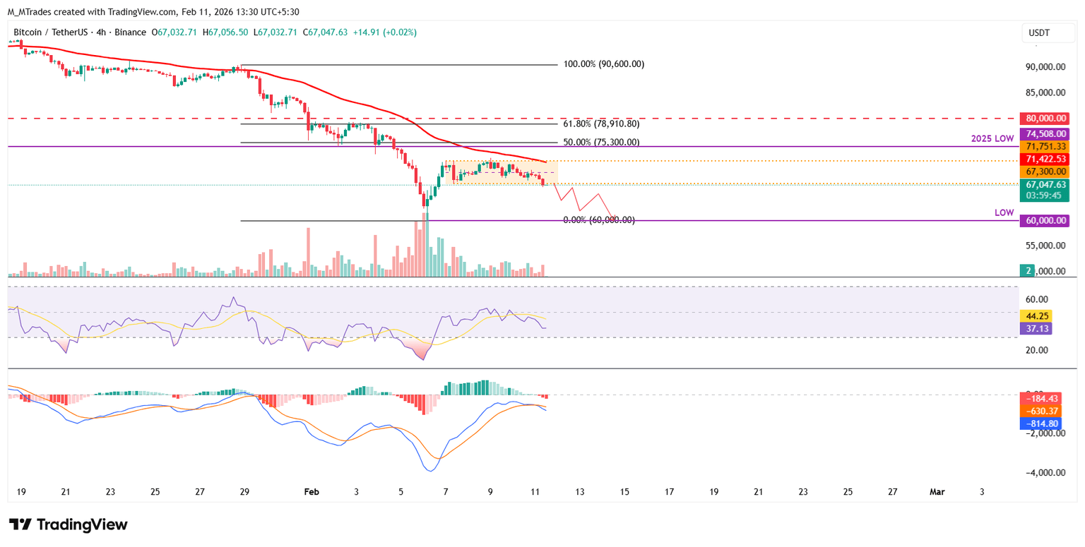 El precio del Bitcoin en el gráfico de 4 horas muestra que el Rey de las Criptomonedas ha estado cotizando lateralmente entre 67.300$ y 71.751$ después de recuperarse de un mínimo de 60.000$ el viernes. En el momento de escribir el miércoles, está cayendo por debajo del límite inferior de esta consolidación.