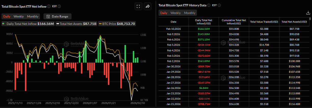 La demanda institucional muestra leves signos de recuperación hasta ahora esta semana. Según datos de SoSoValue, los ETFs de Bitcoin al contado registraron una leve entrada de 166,56 millones de dólares el martes, marcando el tercer día consecutivo de flujos netos positivos desde el viernes pasado. Si las entradas continúan e intensifican, el BTC podría ver alguna recuperación.