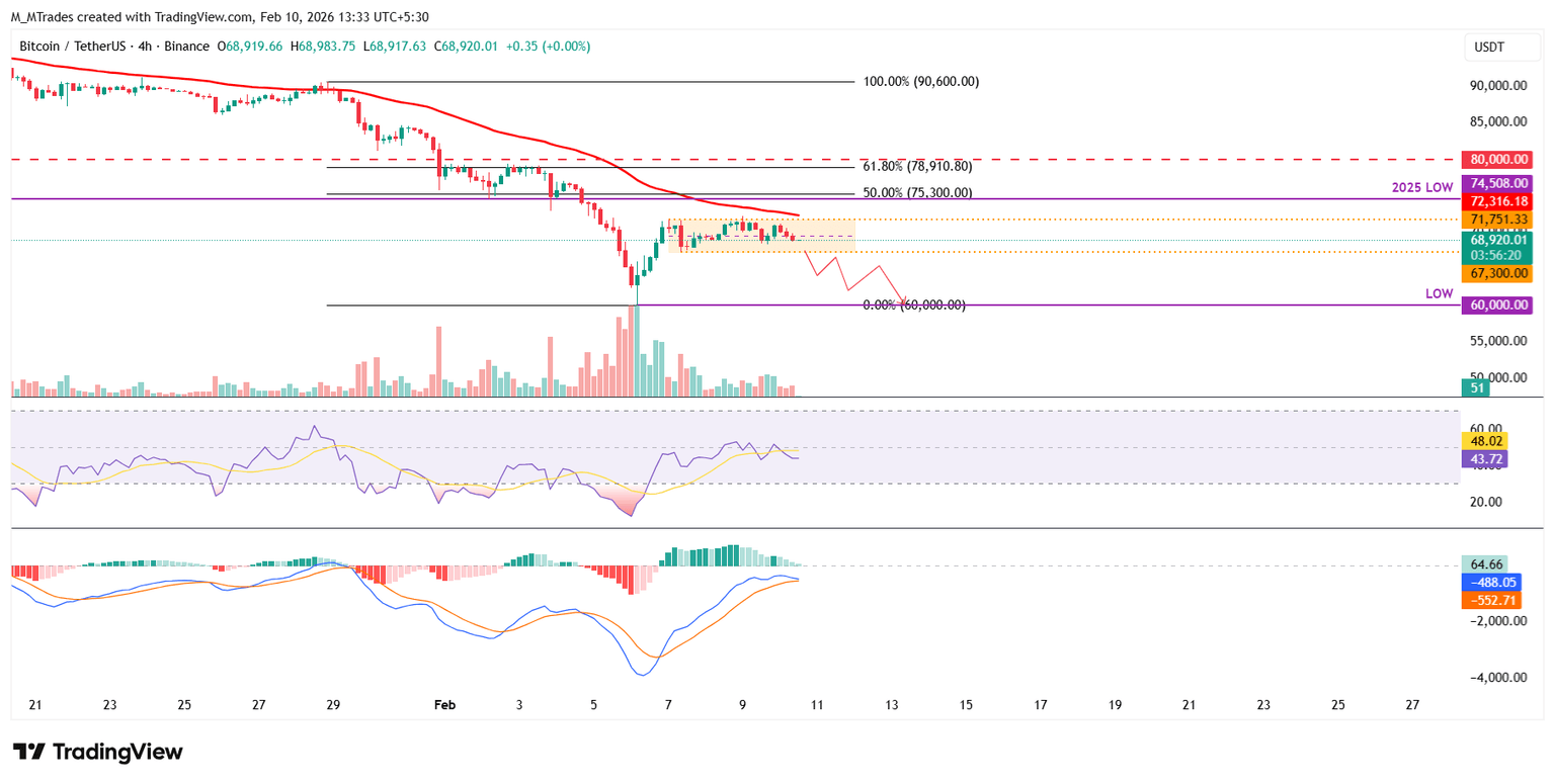Si BTC continúa su tendencia a la baja, podría extender la caída hacia el retroceso de Fibonacci del 78.6% (dibujado desde el mínimo de agosto de 2024 de 49.000$ hasta el máximo histórico de octubre de 2025 de 126.199$) en 65.520$.