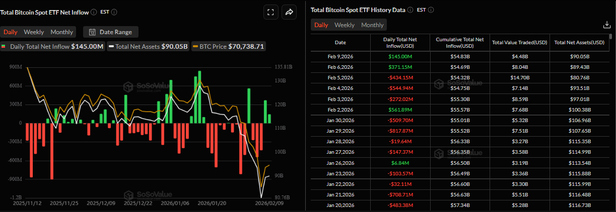 La demanda institucional muestra leves signos de recuperación. Según datos de SoSoValue, los fondos cotizados en bolsa (ETF) de Bitcoin al contado registraron una leve entrada de 145 millones de dólares el lunes, marcando el segundo día consecutivo de entradas tras 371,15 millones de dólares el viernes. Si esta entrada continúa e intensifica, BTC podría ver alguna recuperación.