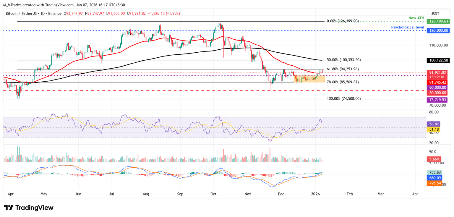 Pronóstico del Bitcoin: El BTC cae por debajo de 92.000$, el impulso se enfría cerca de la resistencia