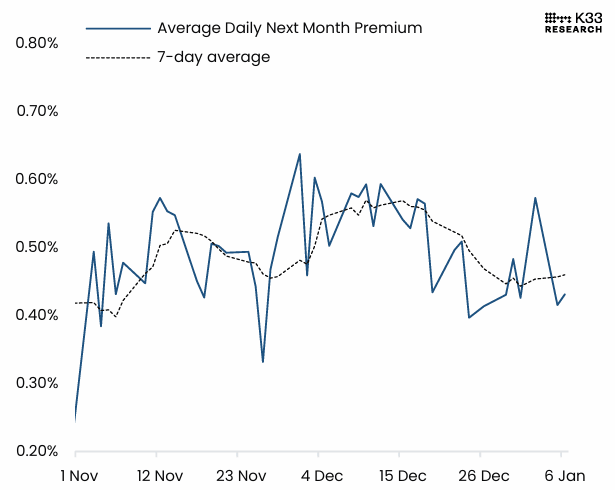 Un informe de K33 Research el martes indicó que no hay signos de optimismo en los mercados de derivados. El informe explica que la posición en el Chicago Mercantile Exchange (CME) se mantiene en gran medida pasiva, con el apalancamiento de fin de año disminuyendo a mínimos más profundos, pero ha visto una recuperación modesta en los primeros días de este año.