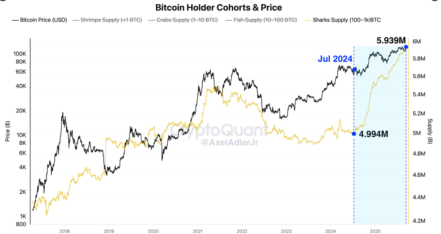 Los datos de CryptoQuant indican que desde julio de 2024, las carteras de tiburones (que poseen entre 100 y 1.000 BTC) han acumulado casi 1 millón de BTC, llevando su saldo total a aproximadamente 5.9 millones de BTC, lo que resalta la creciente confianza entre los inversores de tamaño medio.