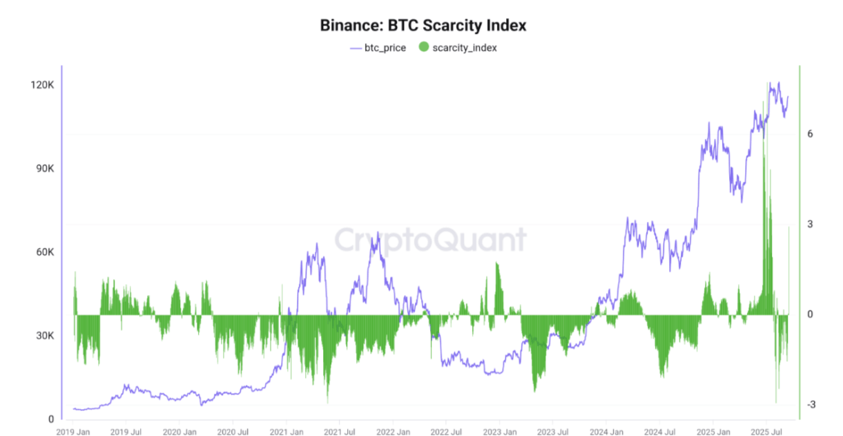 Los datos de CryptoQuant muestran que el Índice de Escasez de Bitcoin en Binance experimentó un repunte positivo repentino el domingo, marcando la primera vez desde el pasado junio. Un repunte repentino a menudo significa que una gran cantidad de Bitcoin fue retirada de la plataforma o que las órdenes de venta cayeron significativamente, haciendo que la oferta disponible se vuelva repentinamente escasa. Históricamente, cuando la métrica se dispara y se mantiene positiva durante varios días consecutivos, el precio del BTC ha aumentado drásticamente, como se vio en junio, cuando el BTC se acercó a 120.000$ por primera vez.