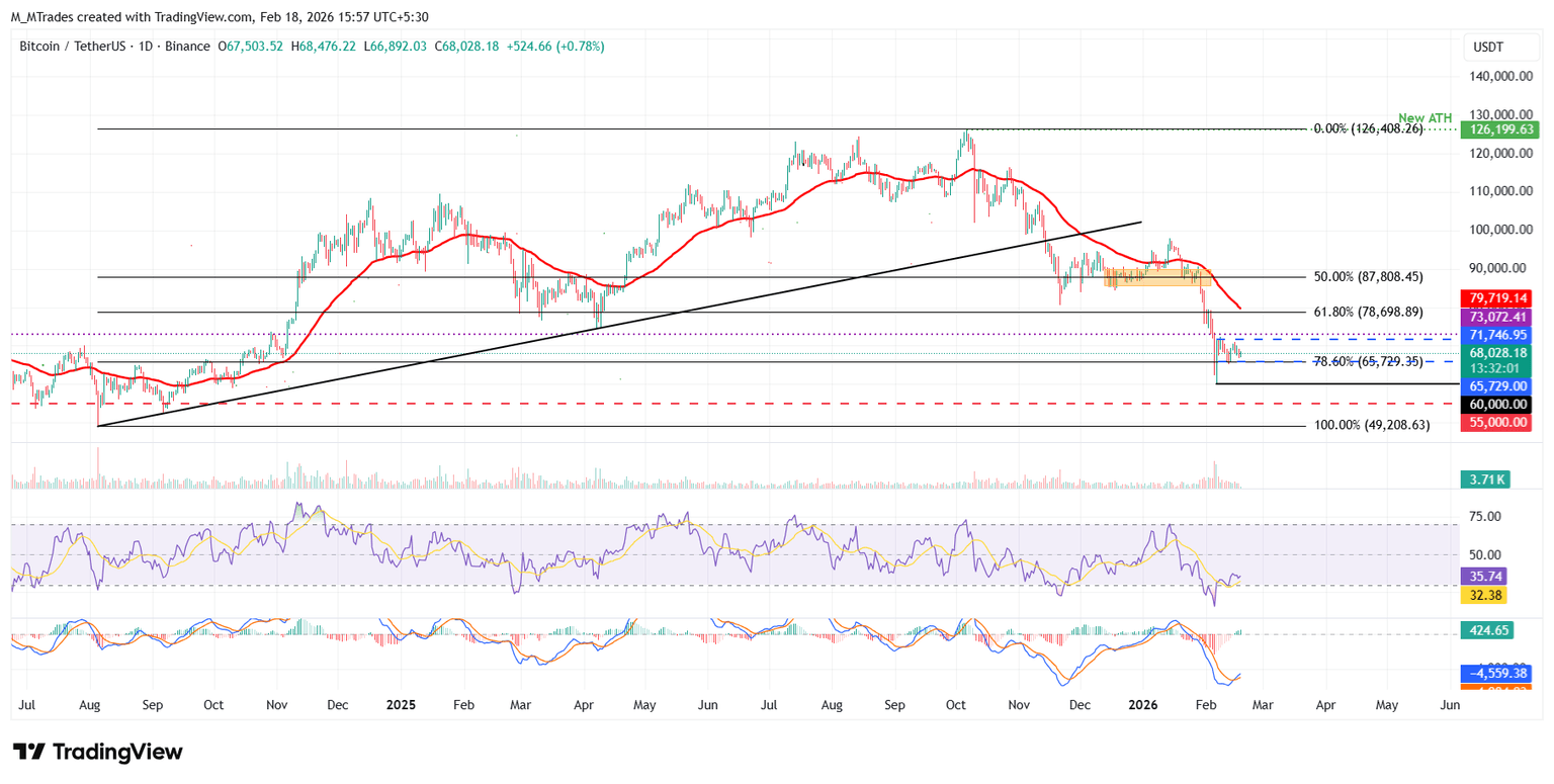 El precio del Bitcoin ha estado consolidándose dentro de un rango entre 65.729$ y 71.746$ desde el 7 de febrero. El BTC ha caído un 2% hasta ahora esta semana y, a partir del miércoles, cotiza alrededor de 68.000$ y se acerca al límite inferior de consolidación.