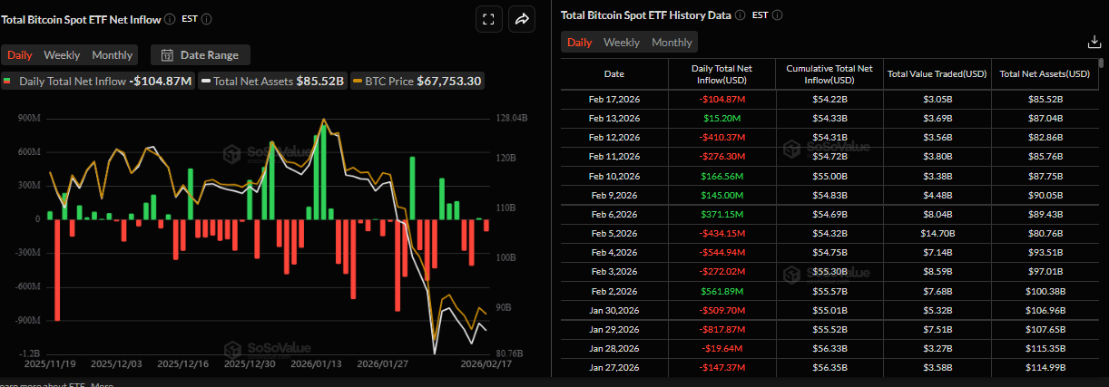 La demanda institucional de Bitcoin muestra un posicionamiento institucional cauteloso, apoyando su continua consolidación de precios. Los datos de SoSoValue muestran que los ETFs al contado registraron una leve salida de 104.87 millones de dólares el martes, tras la cuarta semana consecutiva de retiros. Si esta tendencia continúa e intensifica, el BTC podría ver una corrección adicional.