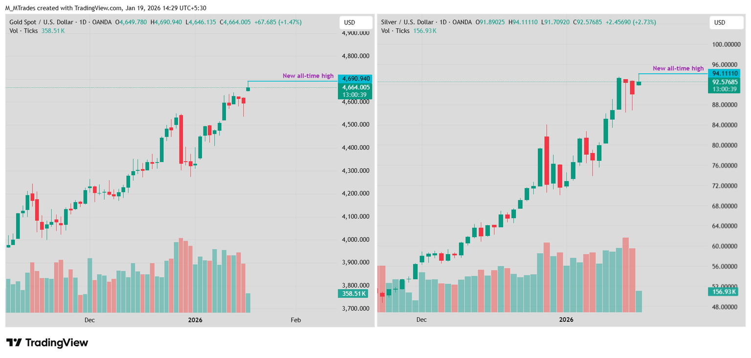 Estas crecientes tensiones comerciales desencadenaron un sentimiento de aversión al riesgo entre los comerciantes el lunes, lo que llevó a los inversores a moverse hacia activos de refugio seguro como el Oro (XAU) y la Plata (XAG), cuyos precios alcanzaron nuevos máximos históricos (ATH) de 4.690,94$ y 94,11$, respectivamente, como se muestra en el gráfico a continuación.