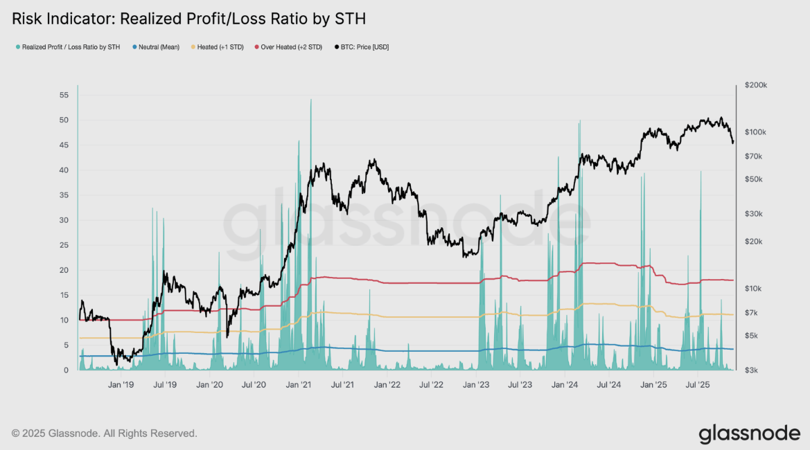 El informe explicó además que, con una estructura de mercado debilitada, la liquidez se convierte en la clave para entender lo que viene a continuación. Un régimen prolongado de baja liquidez aumenta el riesgo de una contracción adicional, y la relación de Beneficio/Pérdida Realizada de STH ofrece una de las ventanas más claras hacia el actual impulso de demanda. La relación, que compara los beneficios realizados con las pérdidas realizadas entre los inversores recientes, cayó por debajo de su media neutral (4.3 veces) a principios de octubre y ahora se ha colapsado a 0.07.