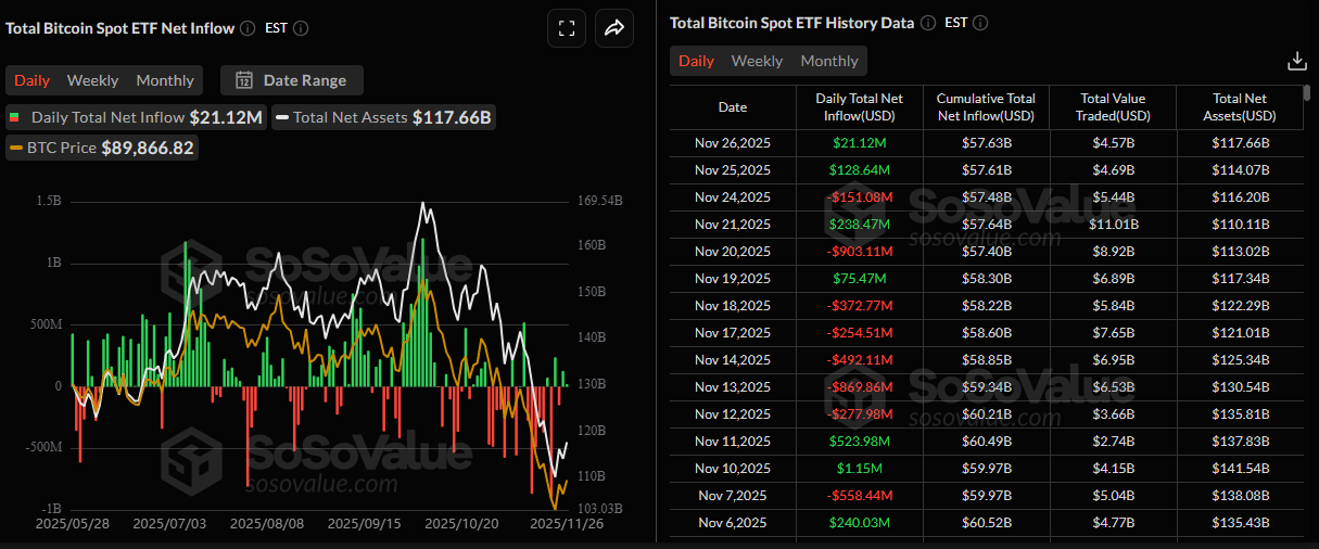 La demanda institucional de Bitcoin muestra una reducción en la presión de venta. Según datos de SoSoValue, los ETF de Bitcoin al contado listados en EE.UU. registraron una leve entrada de 21,12 millones de dólares el miércoles, tras un flujo positivo de 128,64 millones de dólares el día anterior. Sin embargo, estas intensidades de entrada no son tan fuertes como la racha de salidas registrada la semana pasada. Para que el BTC continúe su recuperación, la tendencia de entrada debe persistir e intensificarse.