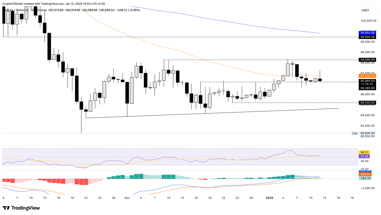 Si el BTC cae por debajo de los 90.000$, podría poner a prueba el mínimo del 24 de diciembre en 86.420$.