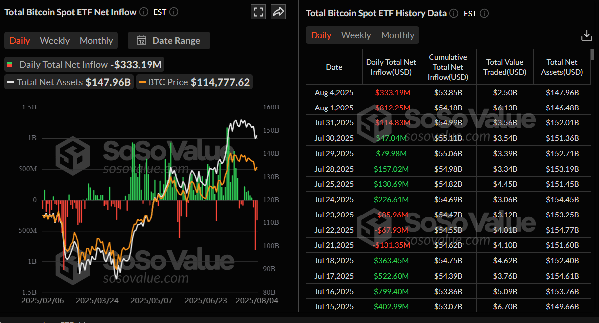 La demanda institucional muestra signos tempranos de debilidad, insinuando una posible caída en el BTC. Según los datos de SoSoValue, los ETFs de Bitcoin al contado en EE.UU. registraron una salida de 333,19 millones de dólares el lunes, continuando su racha de tres días de salidas desde finales de julio. Si estas intensidades de salida continúan, el BTC podría ver una corrección adicional en sus precios.