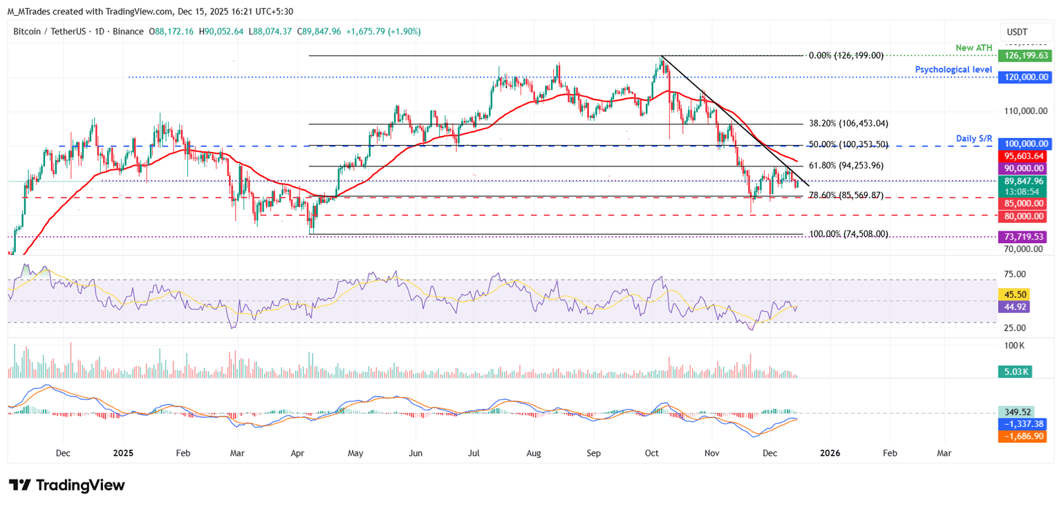 Pronóstico del Precio del Bitcoin: El BTC lucha por recuperar los 90.000$ mientras persiste la presión bajista