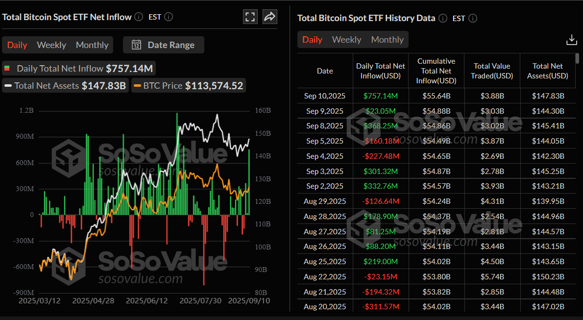 El precio del Bitcoin (BTC) recupera más de 114.000 $ en el momento de escribir el jueves, tras superar la zona de resistencia clave el día anterior. El impulso alcista se ve respaldado por un aumento de 757 millones de dólares en las entradas de ETFs de Bitcoin en EE.UU., el mayor desde mediados de julio, junto con máximos históricos en el S&P 500 y el Nasdaq, lo que impulsó el sentimiento de riesgo en general. Los operadores ahora centran su atención en los próximos datos de inflación de EE.UU. en busca de pistas sobre el posible ritmo de relajación monetaria de la Reserva Federal (Fed).