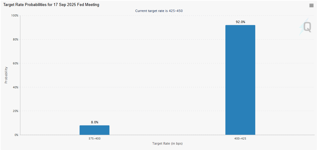 La herramienta FedWatch del CME Group muestra una posibilidad del 92% de un recorte de 25 puntos básicos (pb) por parte del banco central de EE.UU. en la reunión de septiembre y un 8% de probabilidad de un recorte jumbo de 50 pb. Las expectativas sobre el ritmo de relajación monetaria de la Fed podrían pesar sobre el Dólar estadounidense (USD) y aumentar el sentimiento de riesgo, apoyando una recuperación en activos más arriesgados, como el BTC.