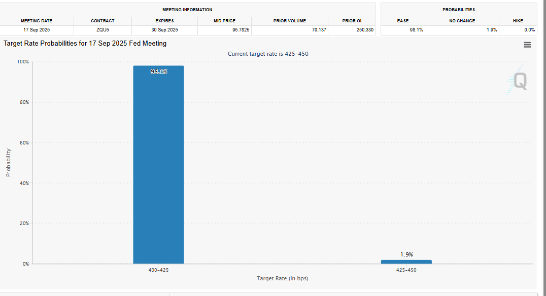 La Oficina de Estadísticas Laborales de EE.UU. informó el martes que los datos del Índice de Precios al Consumidor (IPC) fueron ligeramente más suaves de lo esperado, lo que refuerza el caso para un recorte de tasas de la Fed en septiembre, con probabilidades de un recorte de 25 puntos básicos (pbs) que actualmente se sitúan en el 98%, según la herramienta FedWatch del CME Group.