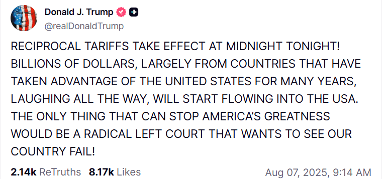 El Bitcoin (BTC) ha estado cotizando de forma lateral por debajo de la marca de 116.000$ hasta ahora esta semana, reflejando un tono cauteloso entre los operadores en medio de una creciente incertidumbre macroeconómica. Los aranceles recíprocos del presidente estadounidense Donald Trump ya están en vigor, mientras que nuevos anuncios relacionados con el comercio podrían potencialmente inyectar nueva volatilidad en los mercados de criptomonedas.
