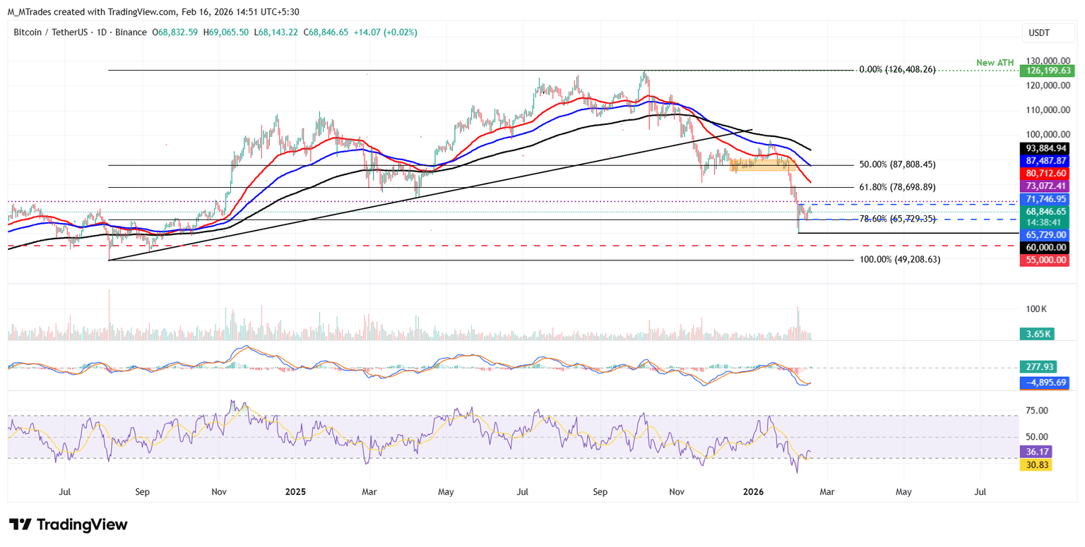 El precio del Bitcoin se ha estado consolidando entre 65.729$ y 71.746$ desde el 7 de febrero. A partir del lunes, el BTC se está negociando dentro de este rango a 68.800$.