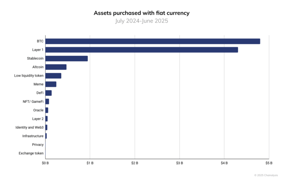 Además, el Bitcoin sigue siendo el principal punto de entrada (sirve como la principal puerta de entrada a la economía cripto), con más de 4.6 billones de dólares en entradas en fiat entre julio de 2024 y junio de 2025, el doble que el de los tokens de Capa 1 (excluyendo BTC y ETH).