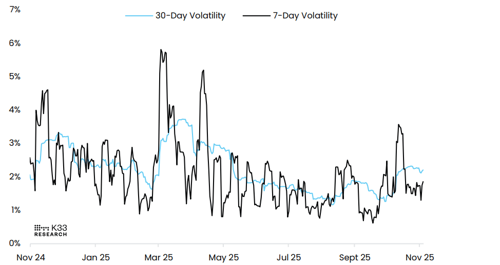Un informe de K33 Research el martes indicó que la reciente corrección del precio del Bitcoin ha ocurrido de manera constante y ordenada, sin un aumento sustancial en la volatilidad a corto plazo.
