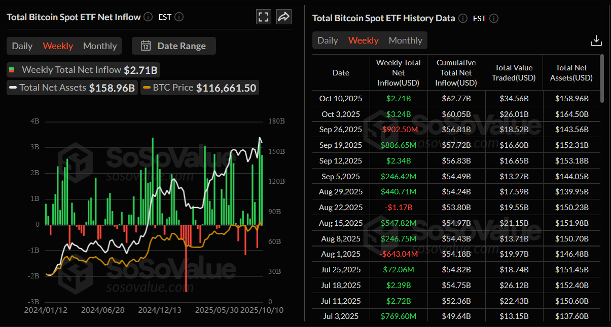La demanda institucional se mantuvo fuerte la semana pasada. Los datos de SoSoValue muestran que los Fondos Cotizados en Bolsa (ETFs) de Bitcoin al contado registraron una entrada semanal de 2.710 millones de dólares, marcando la segunda semana consecutiva de flujo positivo.