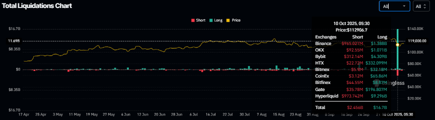 El gráfico de liquidaciones totales de CoinGlass a continuación muestra que el viernes se liquidaron 16.700 millones de dólares en posiciones largas y 2.450 millones en cortas del mercado cripto en general, las liquidaciones más altas hasta ahora este año.