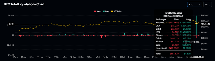 Mientras tanto, el gráfico de liquidaciones totales de BTC también muestra que se borraron más de 4.630 millones de dólares en posiciones largas y 687,52 millones en posiciones cortas el viernes, cuando el BTC alcanzó un mínimo de 102.000$, niveles no vistos desde finales de junio.