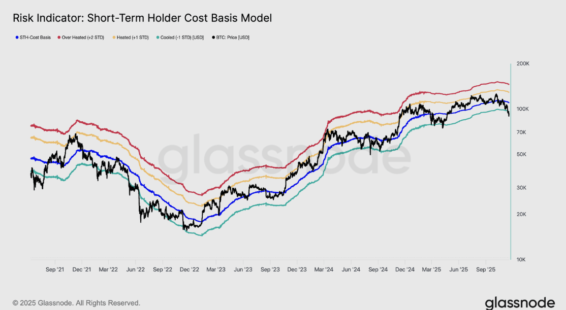 El informe semanal de Glassnode del miércoles destacó un cambio claro en la estructura del mercado del Bitcoin, con una ruptura decisiva por debajo de 97.000$. El BTC luego se desplomó a 89.000$, marcando un nuevo mínimo local por debajo de la banda de una desviación estándar (95.400$) en relación con la base de costo de los tenedores a corto plazo (STH), ahora cerca de 109.500$, como se muestra en el gráfico a continuación.