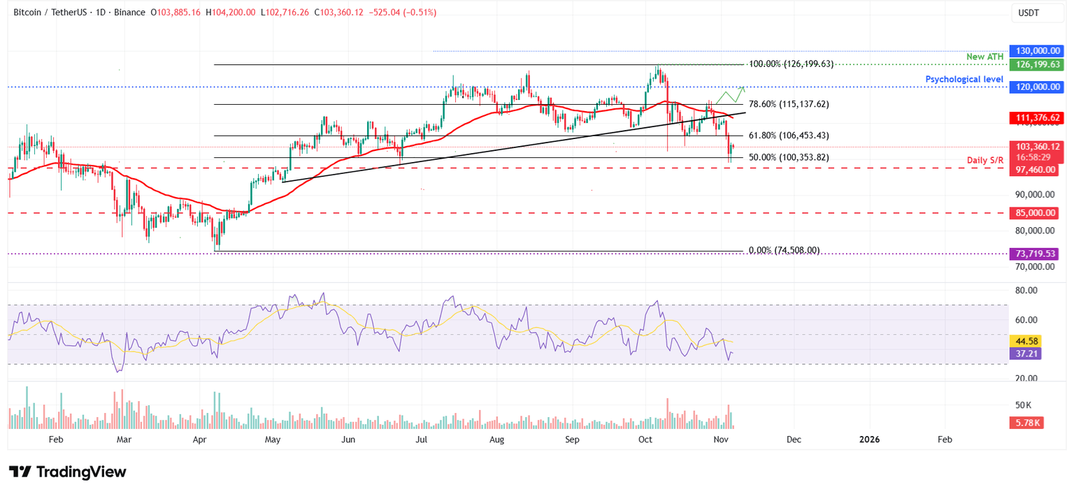 Si el nivel de retroceso del 50% en 100.353$ continúa manteniéndose como soporte, el BTC podría extender su recuperación hacia el siguiente nivel de resistencia clave en 106.435$.