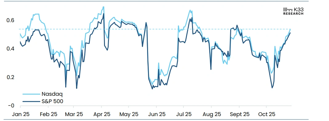 El gráfico a continuación muestra que la correlación entre BTC y las acciones de EE.UU. ha estado aumentando últimamente. La correlación a 30 días entre BTC y el Nasdaq ha subido a 0.53, el nivel más alto desde finales de agosto. Con correlaciones elevadas, las ganancias y el FOMC están listos para influir significativamente en la dirección del BTC.
