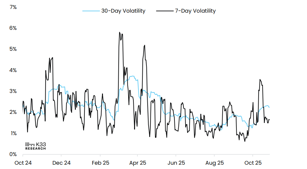 Al observar el gráfico de volatilidad del Bitcoin se revelan las dinámicas actuales del mercado. Mientras que la volatilidad promedio a 7 días del Bitcoin ha disminuido al 1.6% desde el 1.8%, las oscilaciones intradía siguen siendo significativas. El 21 de octubre, el BTC subió un 5% y retrocedió todo el movimiento dentro del mismo período de 24 horas, un acontecimiento raro que señala una liquidez restringida y que típicamente aparece cerca de extremos de precio. Notablemente, tales patrones de ganancia y reversión no se han observado desde la rabieta arancelaria de principios de abril, hace aproximadamente 193 días. Los operadores deben ser cautelosos ante la volatilidad que se avecina.