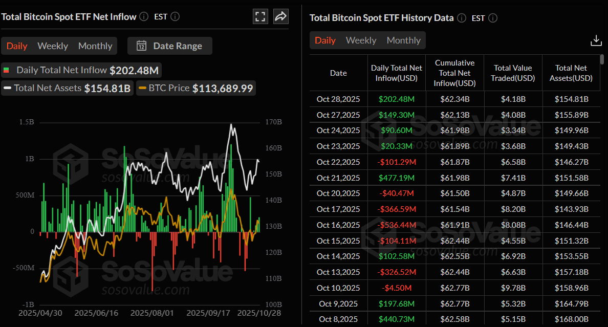El Bitcoin (BTC) se mantiene estable cerca de 113.000$ en el momento de escribir este artículo el miércoles, mientras los operadores adoptan una postura cautelosa ante los catalizadores macroeconómicos y corporativos clave. Se espera que la Reserva Federal de EE.UU. (Fed) anuncie su decisión sobre las tasas de interés, y los gigantes tecnológicos —Microsoft, Alphabet, Meta, Apple y Amazon— están listos para informar sus ganancias, lo que podría traer nueva volatilidad tanto a los mercados tradicionales como a los de criptomonedas. Mientras tanto, los fondos cotizados en bolsa (ETFs) de Bitcoin al contado listados en EE.UU. continúan mostrando una fuerte demanda, registrando 202,48 millones de dólares en entradas el martes, extendiendo una racha positiva de cuatro días.