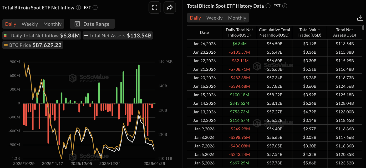 En línea con la reducción de capital disponible, los ETFs de Bitcoin al contado en EE.UU. registraron entradas moderadas de 6,84 millones de dólares el lunes tras cinco días consecutivos de salidas, que alcanzaron un pico de 708 millones de dólares el miércoles.