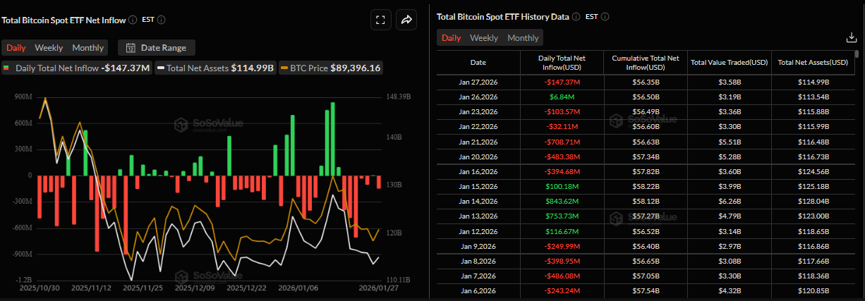 La demanda institucional de Bitcoin señala una postura cautelosa entre los inversores. Los datos de SoSoValue muestran que los ETFs de Bitcoin al contado registraron una salida de 147,37 millones de dólares el martes, tras una entrada de 6,84 millones de dólares el día anterior. Si esta tendencia de salidas intermitentes persiste, podría señalar una vacilación entre los inversores institucionales y limitar el impulso alcista del Bitcoin.