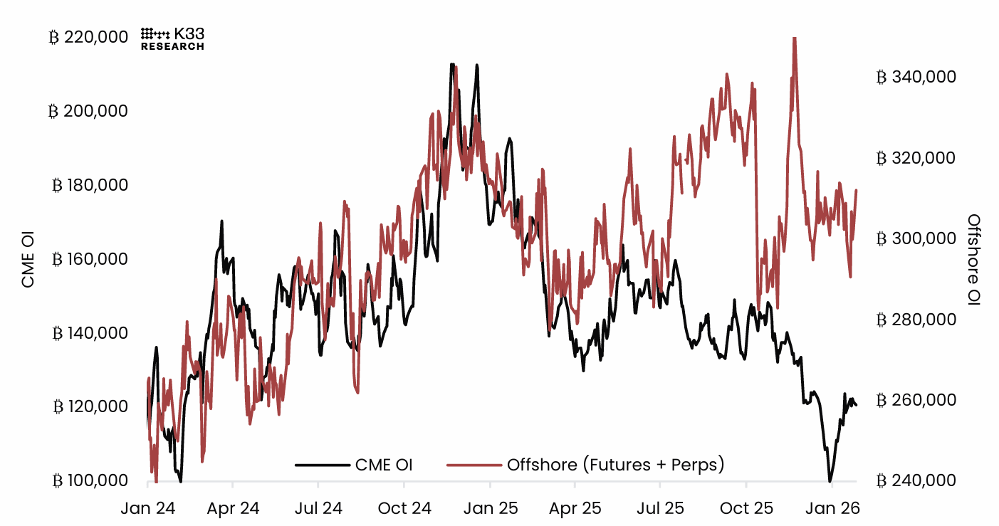 Mientras ambos mercados muestran una participación reducida, el Interés Abierto (OI) de CME ha estado en una tendencia a la baja constante durante el último año y ha disminuido aproximadamente un 50% desde su pico de diciembre de 2024, en contraste con los perpetuos offshore, donde el apalancamiento se ha estabilizado por encima de los mínimos de principios de 2025. "Esto puede atribuirse en parte a la creciente popularidad institucional de las opciones de ETF de BTC para cobertura y construcción de estrategias, reduciendo parte de la cuota de mercado casi monopolística de CME en derivados disfrutada antes de la aprobación de las opciones de ETF. En segundo lugar, una demanda sostenida reducida de exposición apalancada a BTC a través de ETFs de BTC largos apalancados 2x ha debilitado aún más la dominancia de OI de CME durante el último año", señaló el analista de K33.