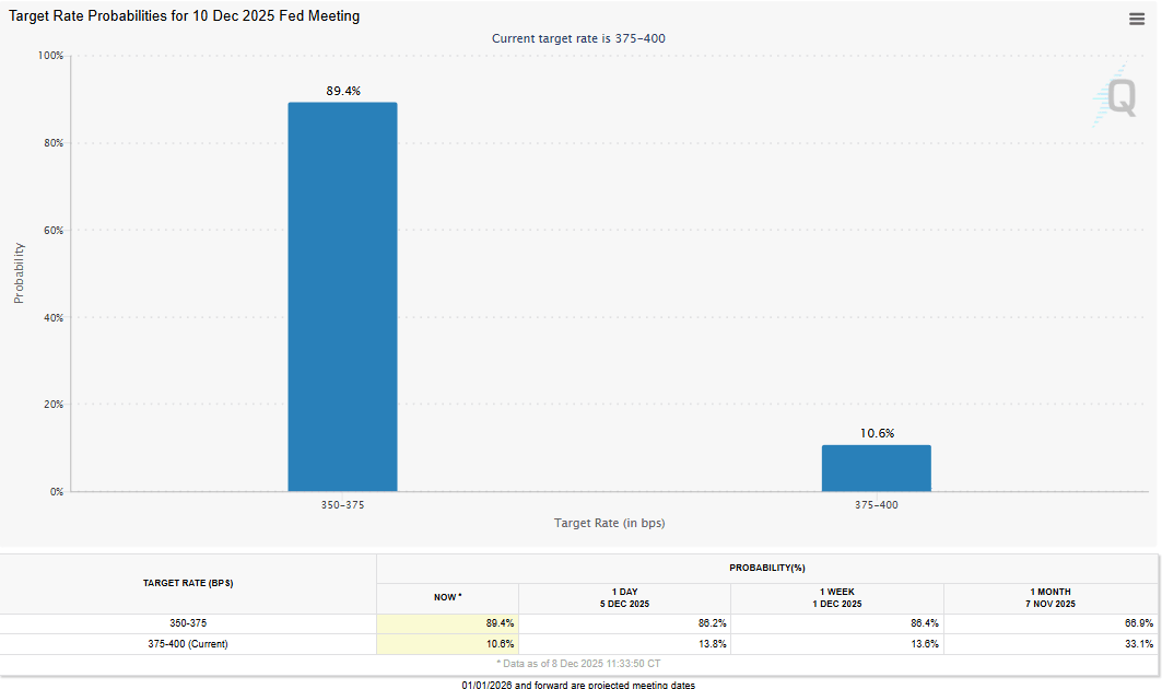 Los participantes del mercado están actualmente valorando en más del 89% la posibilidad de que el banco central de EE.UU. recorte las tasas de interés en 25 puntos básicos al final de una reunión de política de dos días el miércoles, según la herramienta FedWatch de CME que se muestra en el gráfico a continuación.