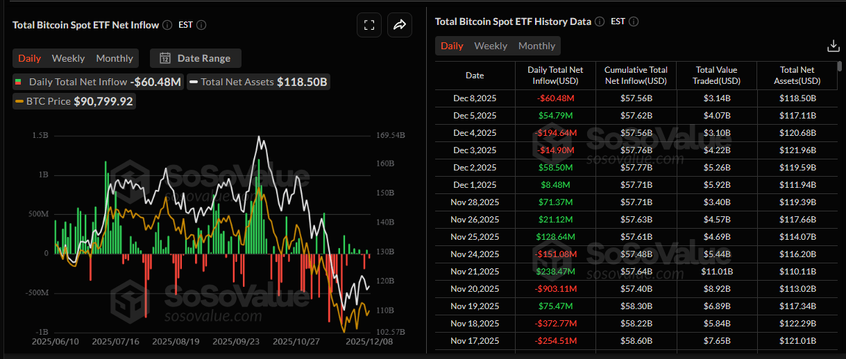 La demanda institucional de Bitcoin muestra una reducción en la presión de venta en comparación con semanas anteriores. Según datos de SoSoValue, los ETFs de Bitcoin al contado listados en EE.UU. registraron una leve salida de 60,48 millones de dólares el lunes, tras una racha de salidas la semana pasada. Para que el BTC continúe su recuperación, los flujos de los ETFs deben volverse positivos e intensificarse.