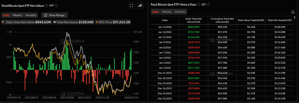 La demanda institucional ha continuado fortaleciéndose hasta ahora esta semana. Los datos de SoSoValue muestran que los ETF de Bitcoin al contado registraron 843,62 millones de dólares en entradas el miércoles, la mayor entrada en un solo día desde el 6 de octubre, marcando el tercer día consecutivo de flujos positivos. Si esta entrada continúa, el BTC podría extender su recuperación en curso.