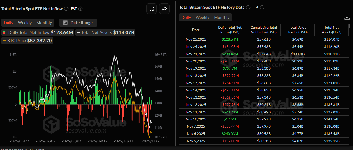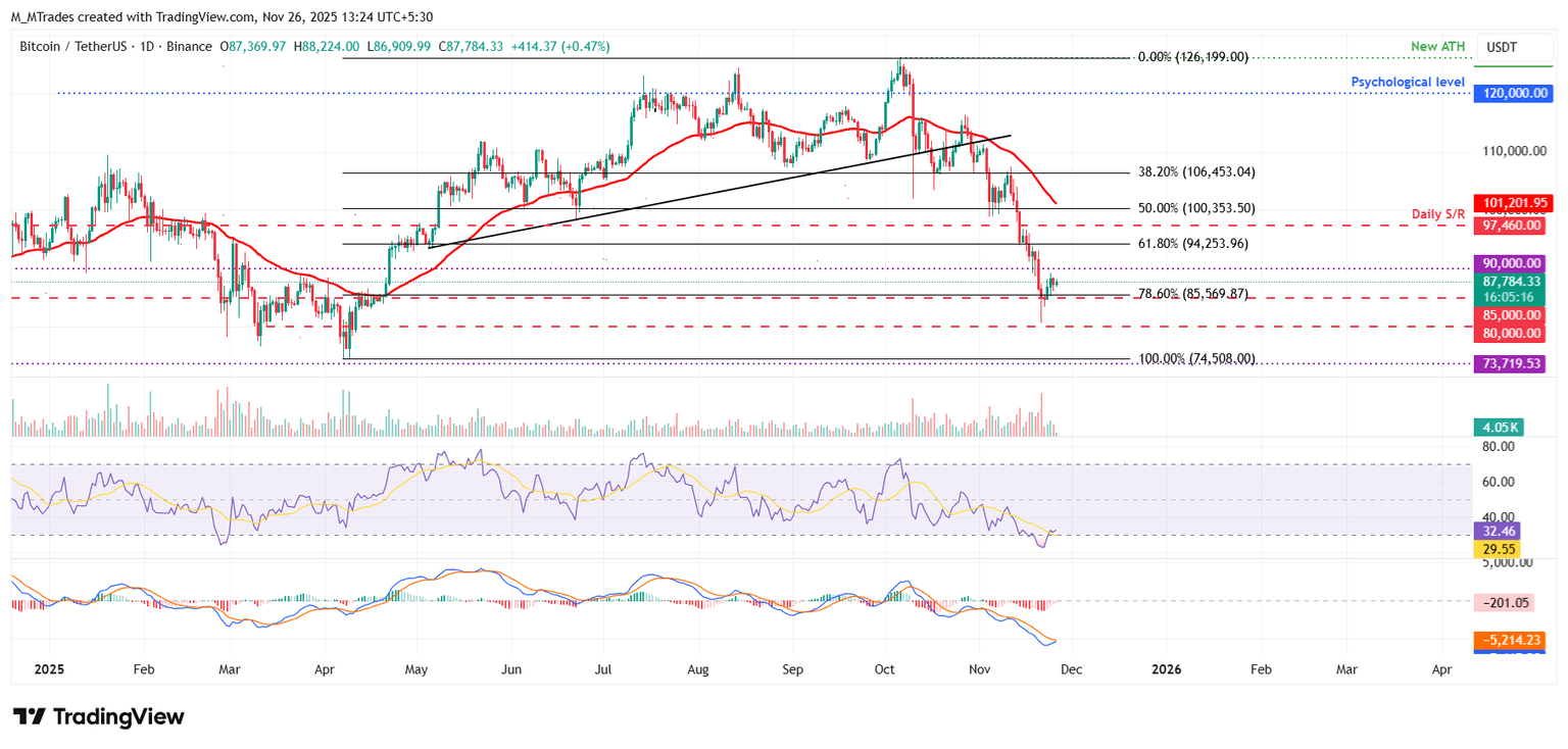 El Bitcoin (BTC) se mantiene alrededor de 87.700$ en el momento de escribir estas líneas el miércoles, tras corregir más del 36% desde su máximo histórico de 126.199$ a principios de octubre. La acción del precio en un rango está respaldada además por flujos mixtos en los Fondos Cotizados en Bolsa (ETFs) de Bitcoin al contado. Además, un informe sugiere que la acción del precio de BTC podría consolidarse esta semana, ya que los mercados de EE.UU. estarán cerrados en la segunda mitad debido a Acción de Gracias.