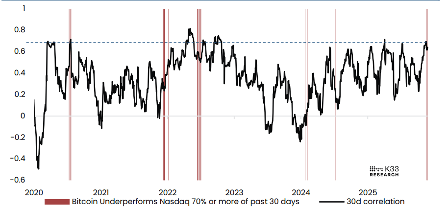 El informe explicó además que el Bitcoin ha tenido un rendimiento inferior al índice Nasdaq (medido con el ETF Invesco QQQ) en 21 de los últimos 30 días de negociación, o el 70% de todos los días de negociación del último mes. Esta situación actual es rara y marca la primera vez que el rendimiento relativo sostenido ha superado el 70% desde julio de 2024.