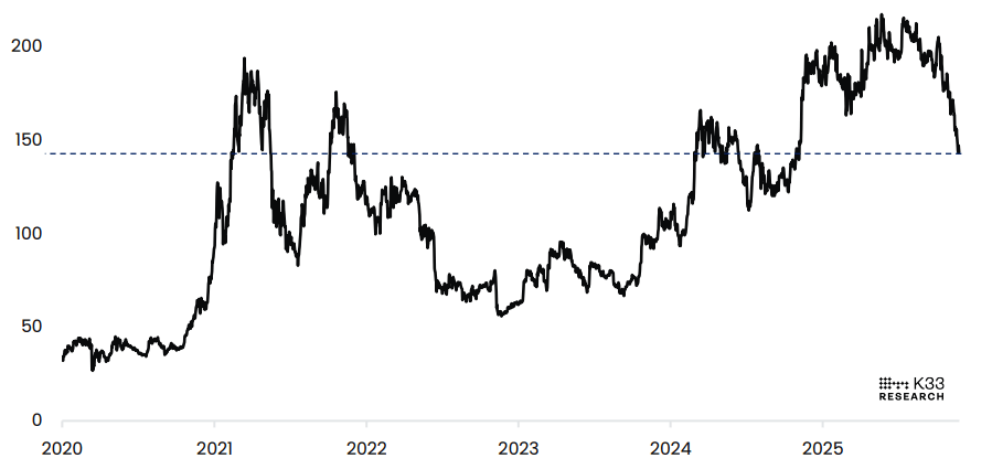 Un informe de K33 el martes destacó que esta semana podría ofrecer respiro y consolidación para BTC, ya que los mercados de EE.UU. estarán completamente cerrados el jueves y parcialmente cerrados el viernes debido a la festividad de Acción de Gracias.