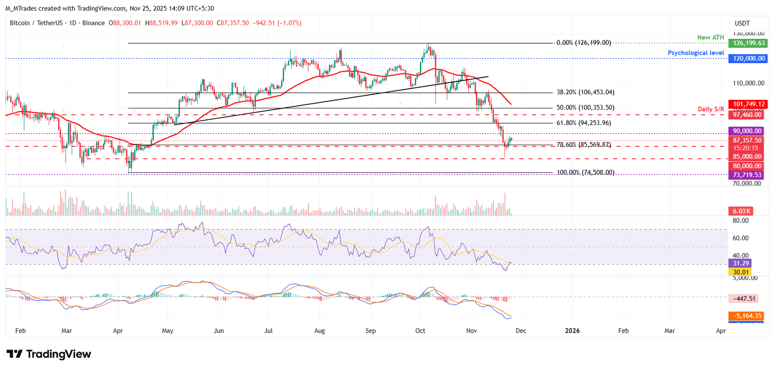 El precio del Bitcoin ha comenzado a estabilizarse después de una venta de 11 días que vio a BTC caer desde el máximo del 11 de noviembre de 107.500$ hasta un mínimo de 80.600$. En los últimos días, el BTC ha montado un fuerte rebote hacia 88.000$ y se mantiene cerca de 87.000$ al momento de escribir el martes, señalando que un posible mínimo local puede estar formándose, aunque aún falta confirmación.