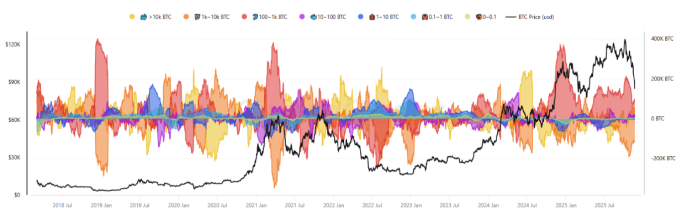 Estas grandes ballenas han continuado distribuyendo, junto con los inversores minoristas (con 0 a 1 BTC y de 1 a 10 BTC). En general, BTC podría haber formado un posible mínimo local, respaldado por un fuerte rebote y acumulación de las billeteras de tamaño mediano. Sin embargo, la venta persistente del crucial grupo de 1.000 a 10.000 BTC sigue limitando la confirmación de una reversión de tendencia más amplia. La recuperación actual del precio es alentadora, pero se requiere un cambio decisivo en el comportamiento de las ballenas para señalar el fin de la fase bajista.