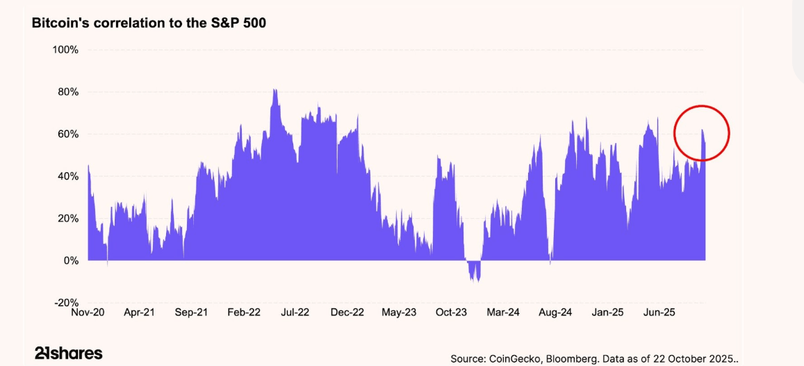 El informe semanal de 21Shares señaló que el crash del mercado del 10 de octubre fue provocado por los aranceles propuestos del 100% de Trump sobre las importaciones chinas, lo que reavivó los temores de guerra comercial y empujó la correlación del Bitcoin con el S&P 500 por encima del 60%.