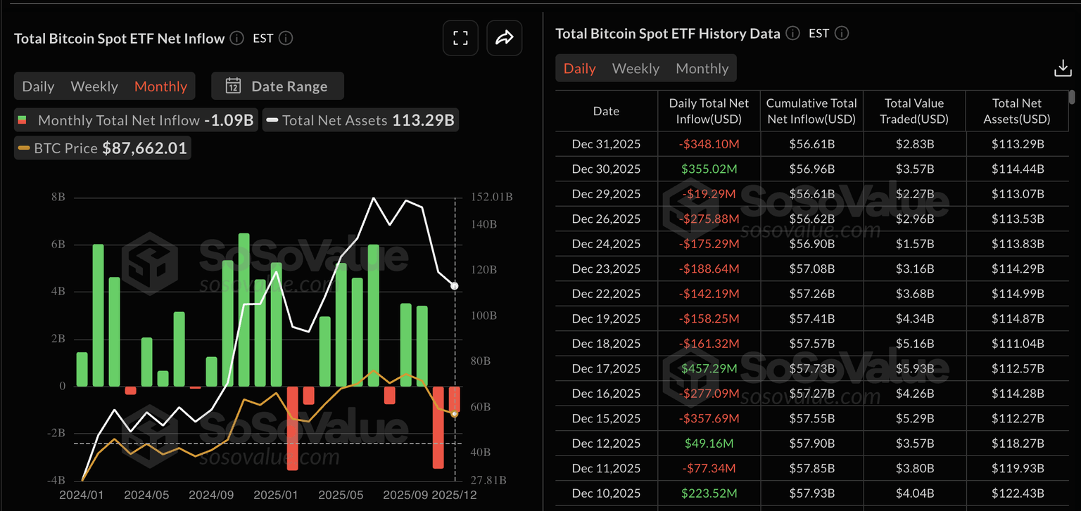 Los Fondos Cotizados en Bolsa (ETFs) centrados en Bitcoin en EE.UU. registraron una salida de 348 millones de dólares el miércoles, casi borrando los 355 millones de dólares de entrada del día anterior. Estos ETFs registraron una salida de 1.090 millones de dólares, avanzando en la racha de retiros tras los 3.480 millones de dólares que se descargaron en noviembre.