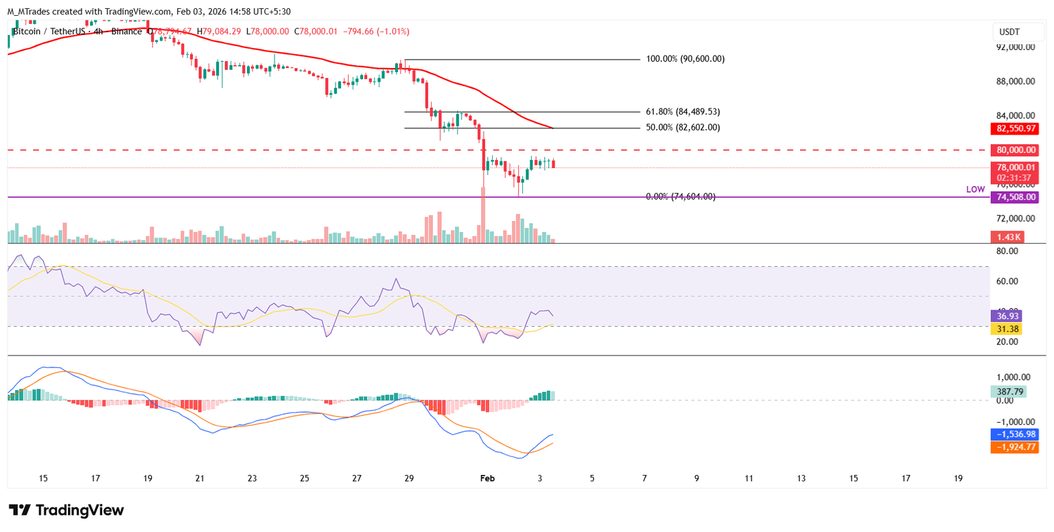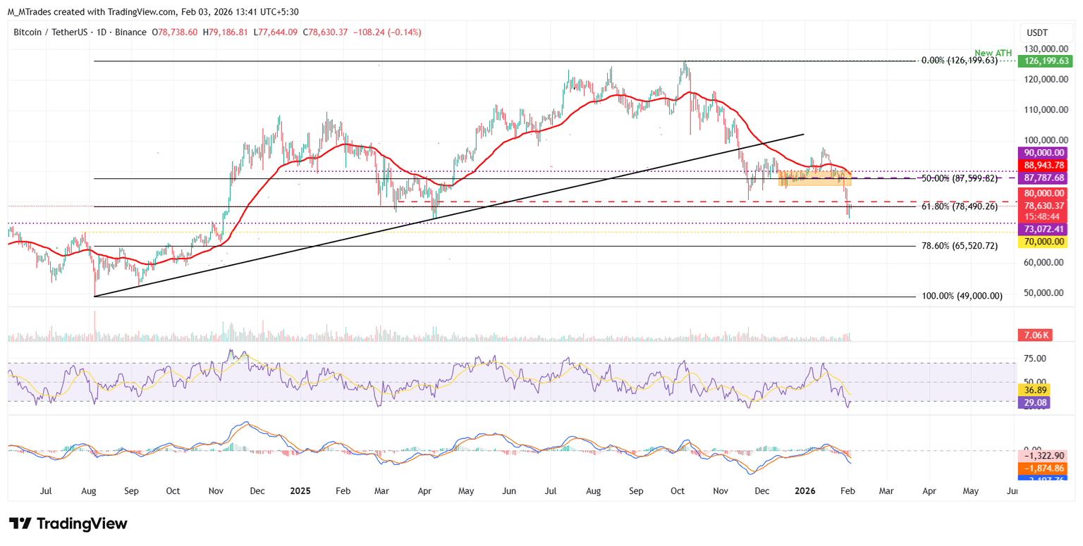 En el gráfico diario, el BTC cerró por debajo del nivel de retroceso de Fibonacci del 61.8% (desde el mínimo de agosto de 2024 de 49.000$ hasta el máximo histórico de octubre de 2025 de 126.199$) en 78.490$ el domingo, y enfrenta resistencia alrededor de este nivel el martes.