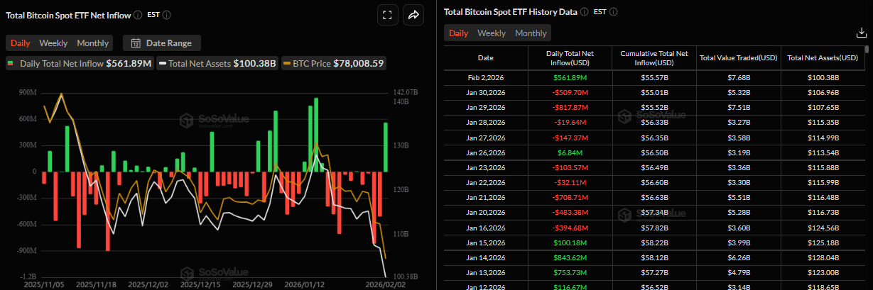 La demanda institucional apoyó una ligera recuperación en Bitcoin al inicio de la semana. Los datos de SoSoValue muestran que los ETF de Bitcoin al contado registraron una nueva entrada de 561.89 millones de dólares el lunes, rompiendo la racha de salidas desde la semana pasada. Además, el flujo del lunes fue la entrada más alta en un solo día desde mediados de enero. Para que el repunte de alivio se mantenga, las entradas de los ETF deben continuar e intensificarse.