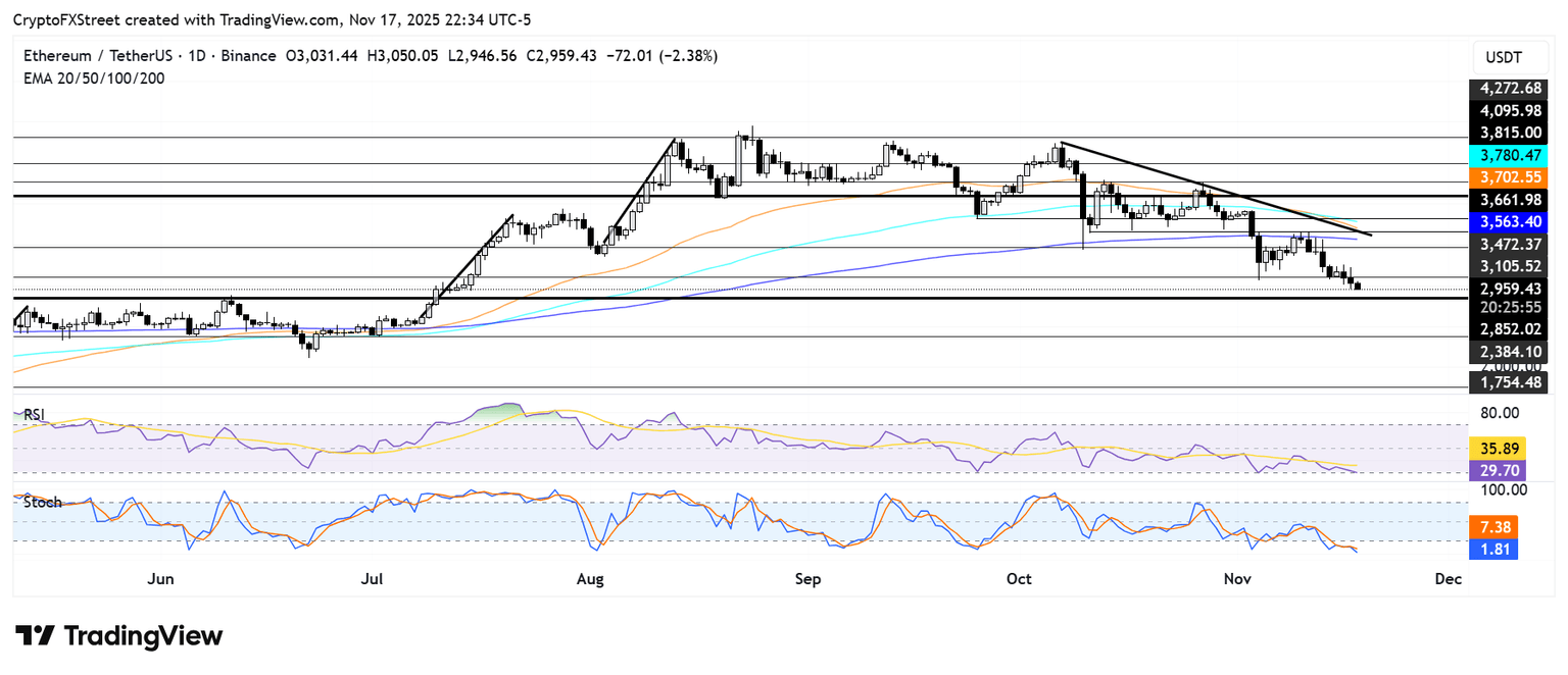 Pronóstico del Precio de Ethereum: ETH apunta a 2.850$ tras romper el soporte de 3.100$