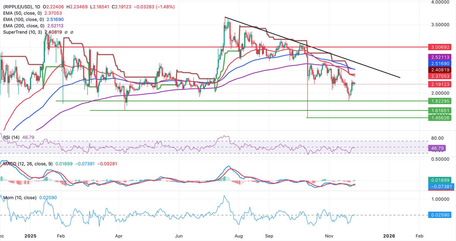 XRP está cotizando a 2.19$ en el momento de escribir este artículo el jueves, presionado por un sentimiento bajista prolongado en todo el mercado de criptomonedas. La media móvil exponencial (EMA) de 50 días en 2.37$, la EMA de 100 días en 2.51$ y la EMA de 200 días en 2.52$ descienden y permanecen apiladas por encima del precio, preservando la presión a la baja.