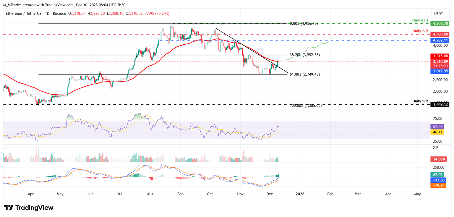 Si ETH cierra por encima de la EMA de 50 días en 3.315$, podría extender el repunte hacia la siguiente resistencia clave en 3.592$.